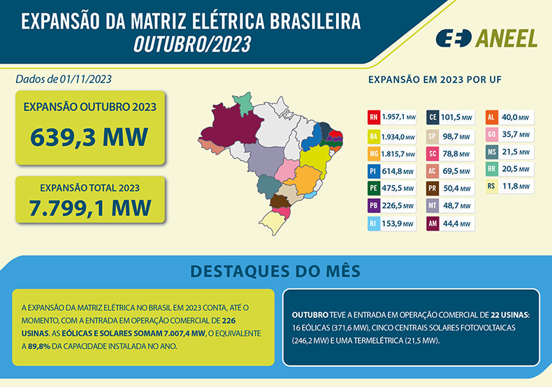 A ampliação da matriz elétrica foi verificada até outubro em 19 estados das cinco regiões brasileiras. Em ordem decrescente, apresentaram os maiores resultados até 31/10 os estados do Rio Grande do Norte (1.957,1 MW), Bahia (1.934,0 MW), Minas Gerais (1.815, 7 MW), Piauí (614,8 MW) e Pernambuco (475,5 MW).