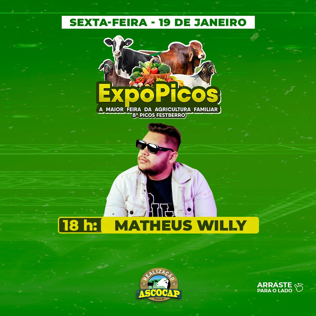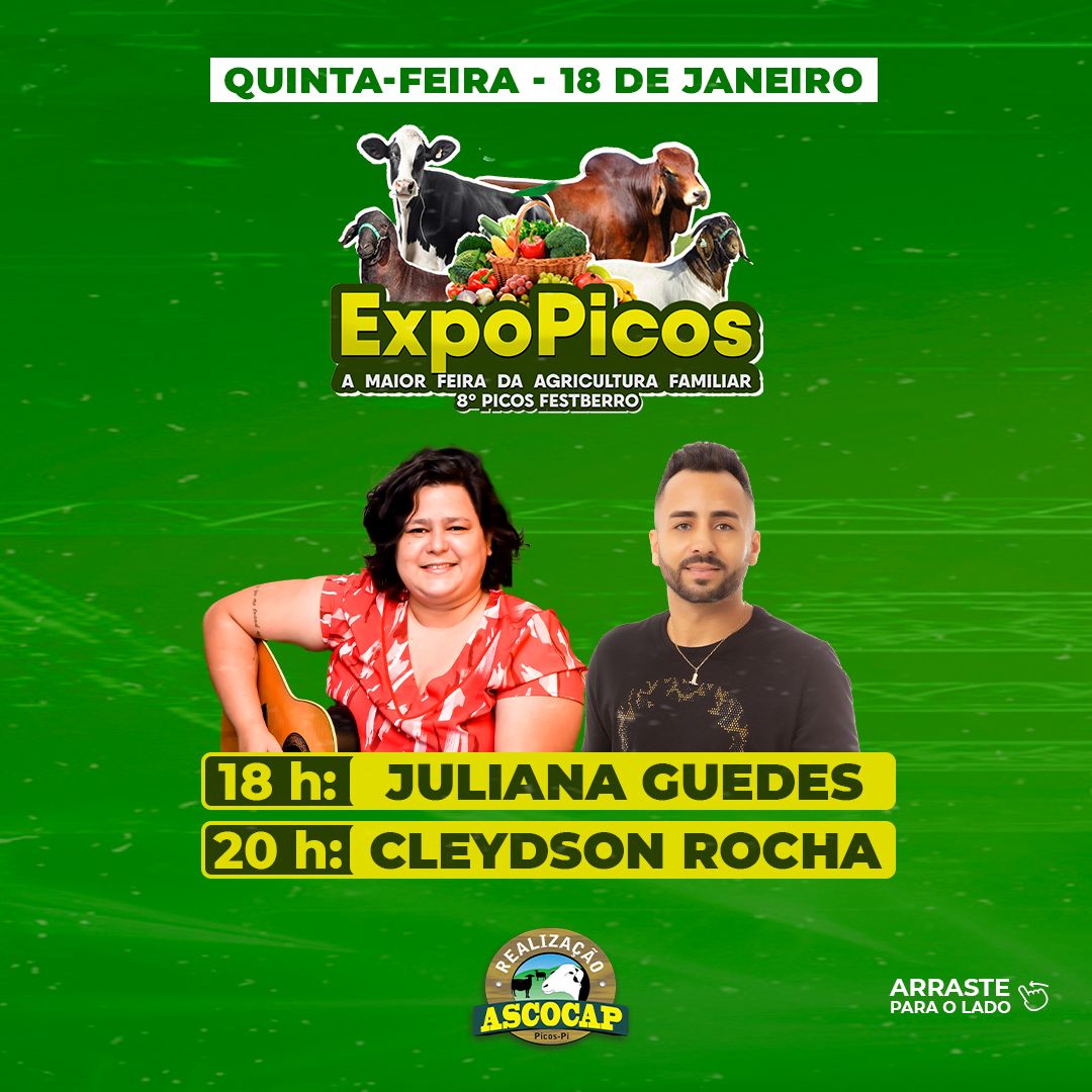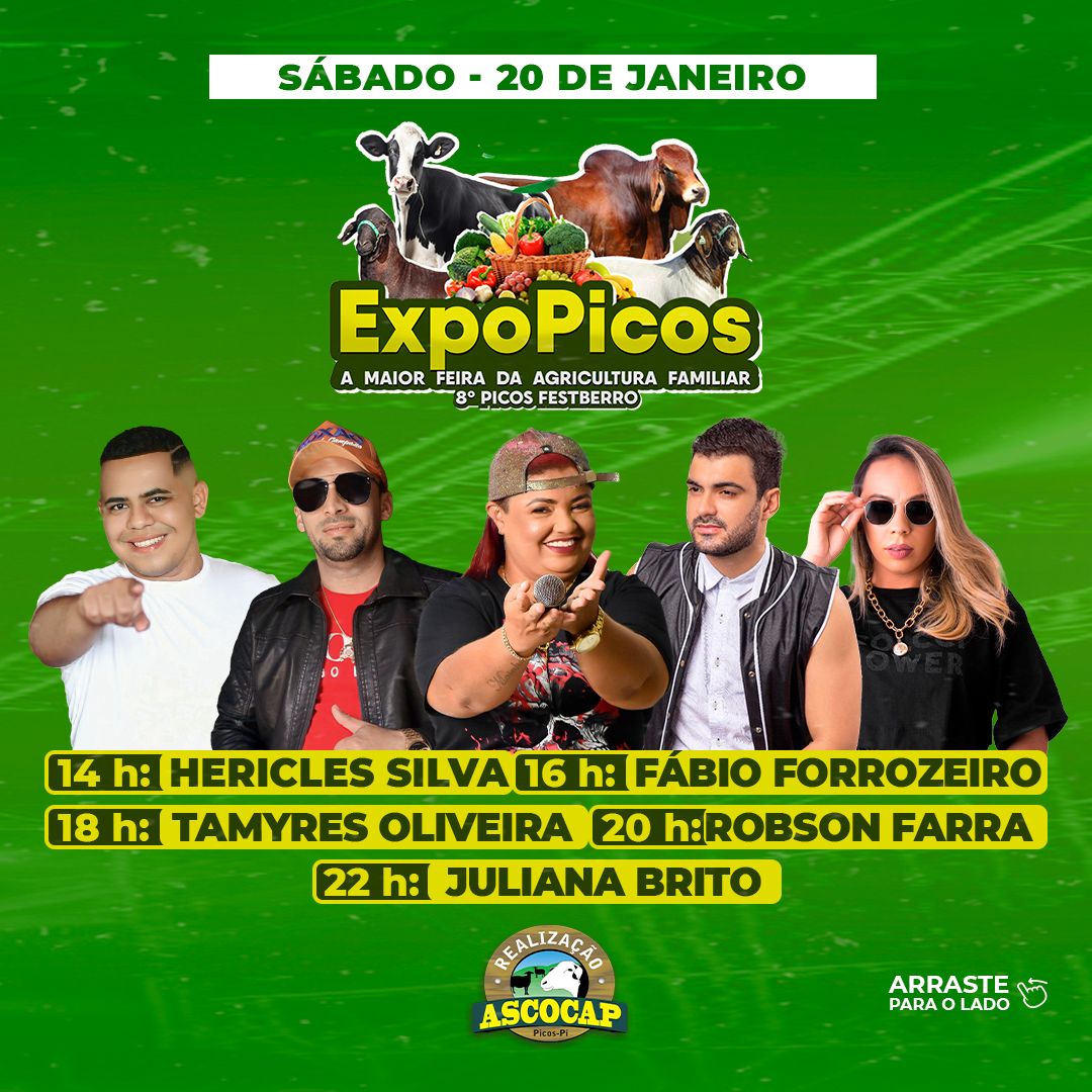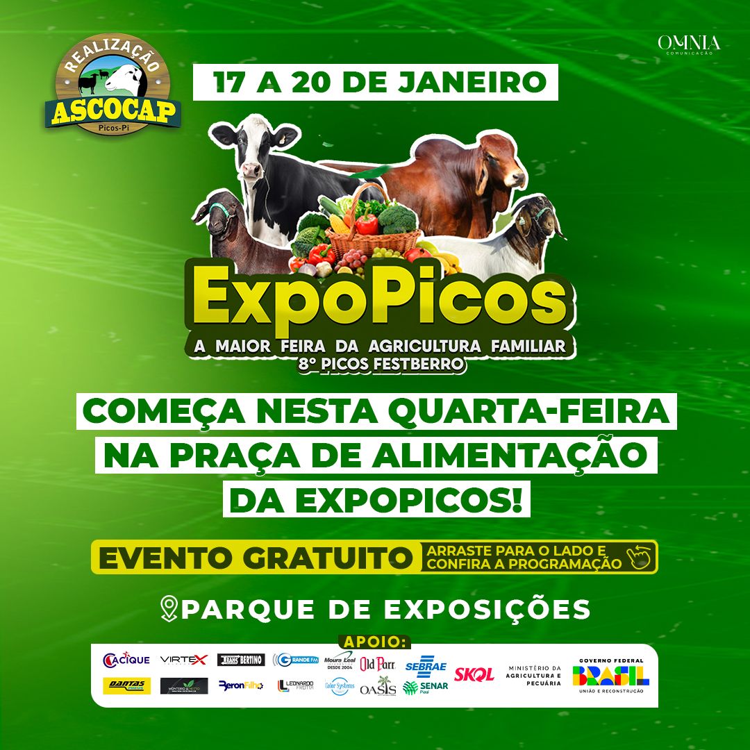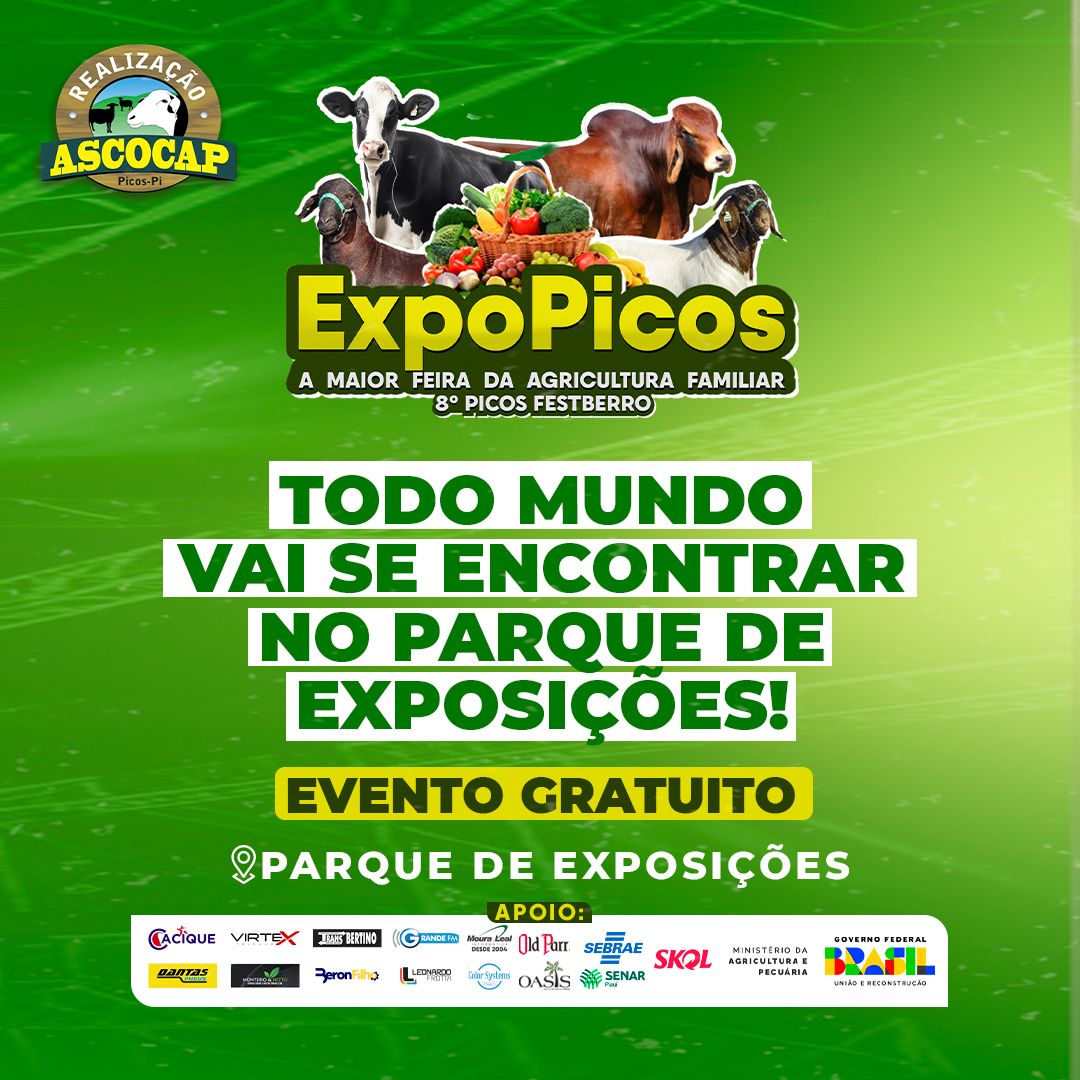 A ExpoPicos acontece nos dias 17, 18,19 e 20 de janeiro no Parque de Exposições de Picos. Com a finalidade de estimular e incentivar a produção agrícola na região de Picos, o evento beneficiará produtores, criadores e empreendedores, além de fomentar a agricultura familiar em todos os seus seguimentos.