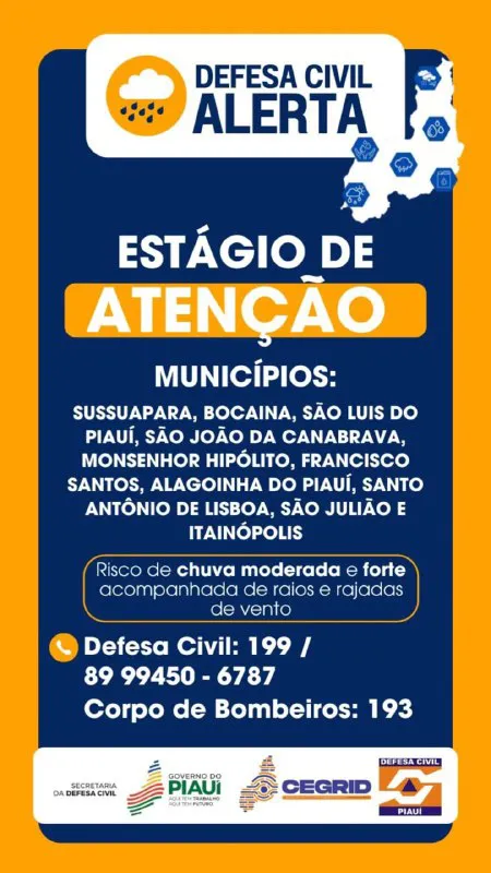 A Defesa Civil reforça que a população deve acionar os contatos em casos de emergência ou situações de risco iminente, através dos seguintes contatos: Defesa Civil: 199 e (89) 99450-6787 e Corpo de Bombeiros: 193.