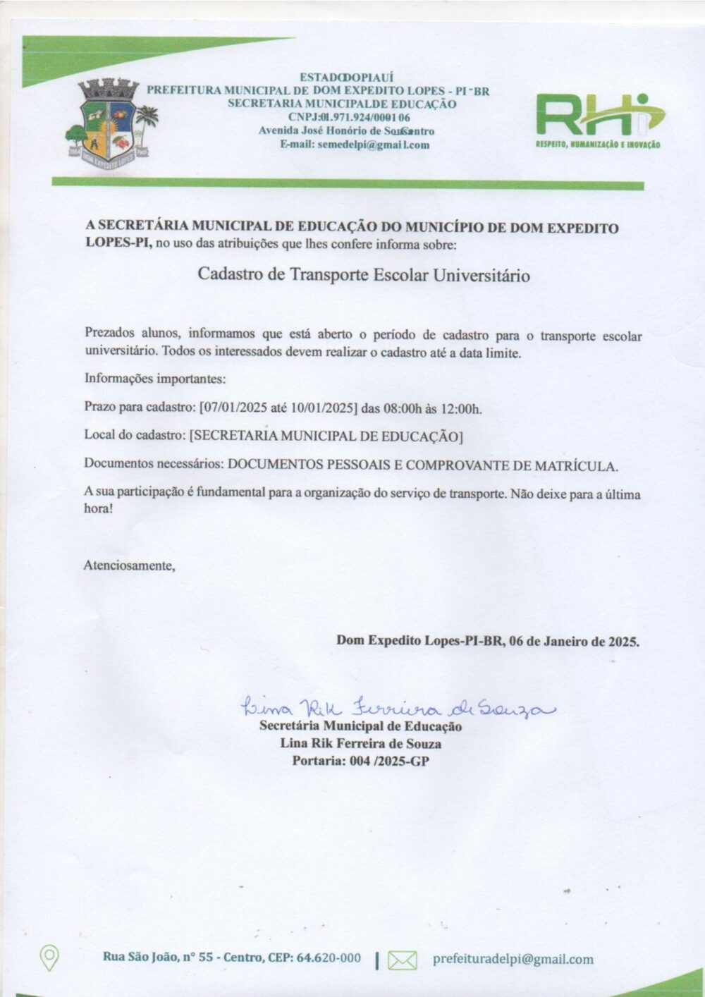 Confira abaixo o comunicado assinado pela Secretária de Educação, Lina Rik;