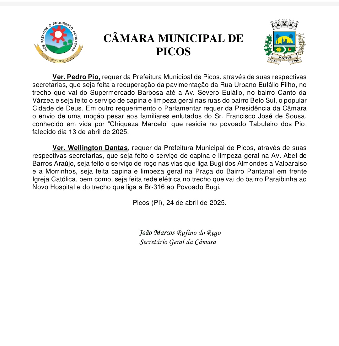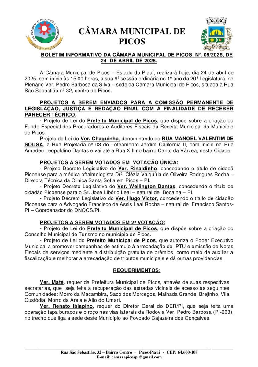 Entre os projetos que estavam em segunda votação, destacaram-se duas propostas de autoria do Prefeito Municipal de Picos. A primeira trata da criação do Conselho Municipal de Turismo, iniciativa que visa fomentar e organizar o setor turístico na cidade. A segunda autoriza o Poder Executivo a promover campanhas de estímulo à arrecadação do IPTU e à emissão de notas fiscais de serviços, mediante a distribuição gratuita de prêmios. O objetivo é fortalecer a fiscalização e aumentar a arrecadação dos tributos municipais.