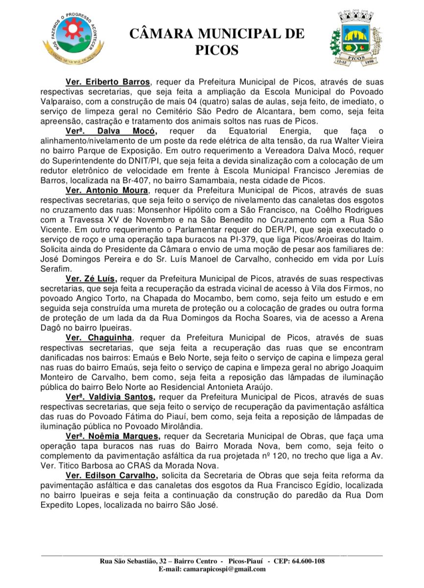 Além dos projetos do Executivo, outros requerimentos foram apresentados pelos vereadores, contemplando diversas áreas como infraestrutura, saúde, educação e mobilidade urbana.