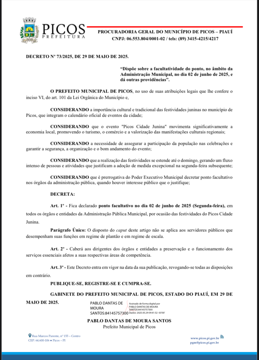 A Prefeitura Municipal de Picos publicou nesta quinta-feira (29), o Decreto nº 73/2025, que estabelece ponto facultativo no dia 2 de junho de 2025 (segunda-feira), em todos os órgãos e entidades da Administração Pública Municipal. A medida ocorre em razão das festividades do Picos Cidade Junina, evento tradicional que movimenta a economia e valoriza a cultura local.