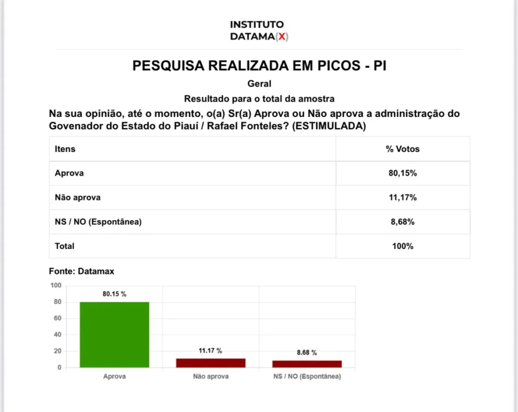Já a aprovação do Governador do Estado do Piauí, Rafael Fonteles (PT), em Picos, conforme esse levantamento do Datamax, foi de 80,15%, contra uma desaprovação de 11,17% e o percentual de 8,68% dos entrevistados que não sabiam ou não quiseram responder a pesquisa.