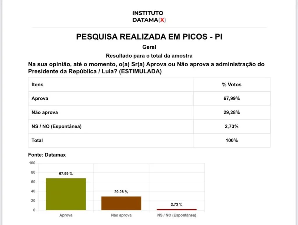 Essa mesma pesquisa também destacou que 67,99% dos entrevistados aprovam a gestão do presidente da República, Lula (PT), 29,28% não aprovam e 2,73% não souberam ou não quiseram responder o questionário.