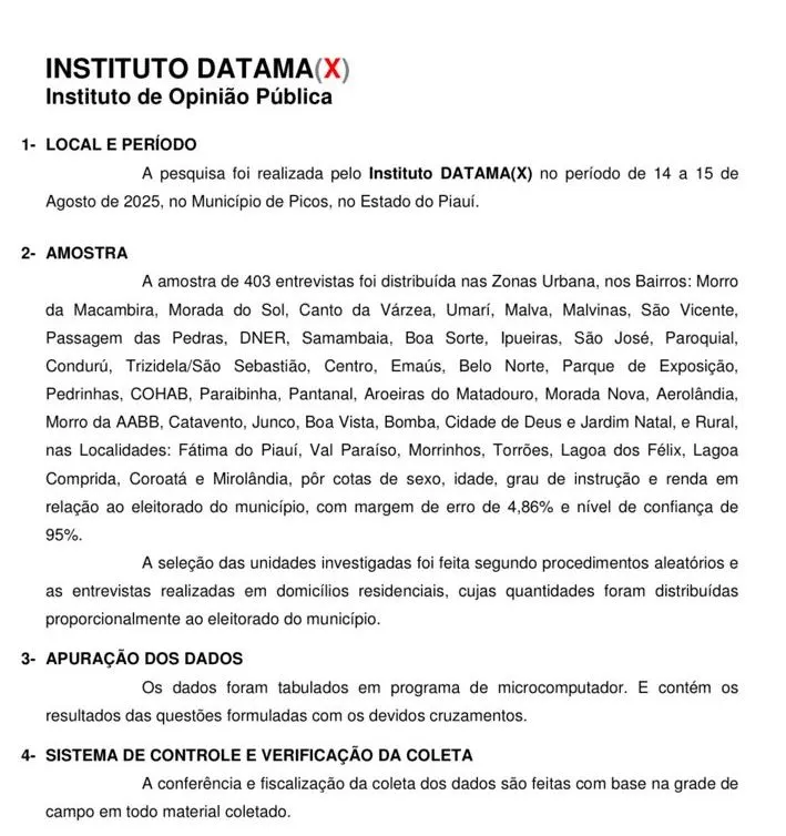 O Instituto Datamax informou que a seleção dos Bairros e Localidades, para realização da pesquisa, foi feita de forma aleatória assim como os domicílios residenciais, cujas quantidades foram distribuídas proporcionalmente ao eleitorado de Picos.