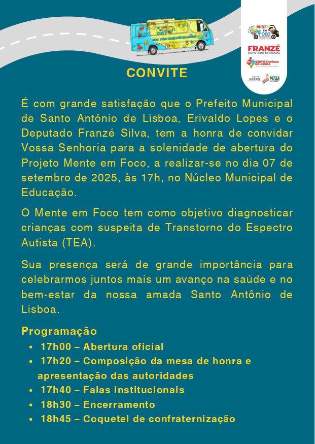 A Prefeitura de Santo Antônio de Lisboa, por meio da Secretaria Municipal de Saúde, realiza no próximo dia 7 de setembro, às 17h, no Núcleo Municipal de Educação, a solenidade de lançamento do Projeto Mente em Foco.