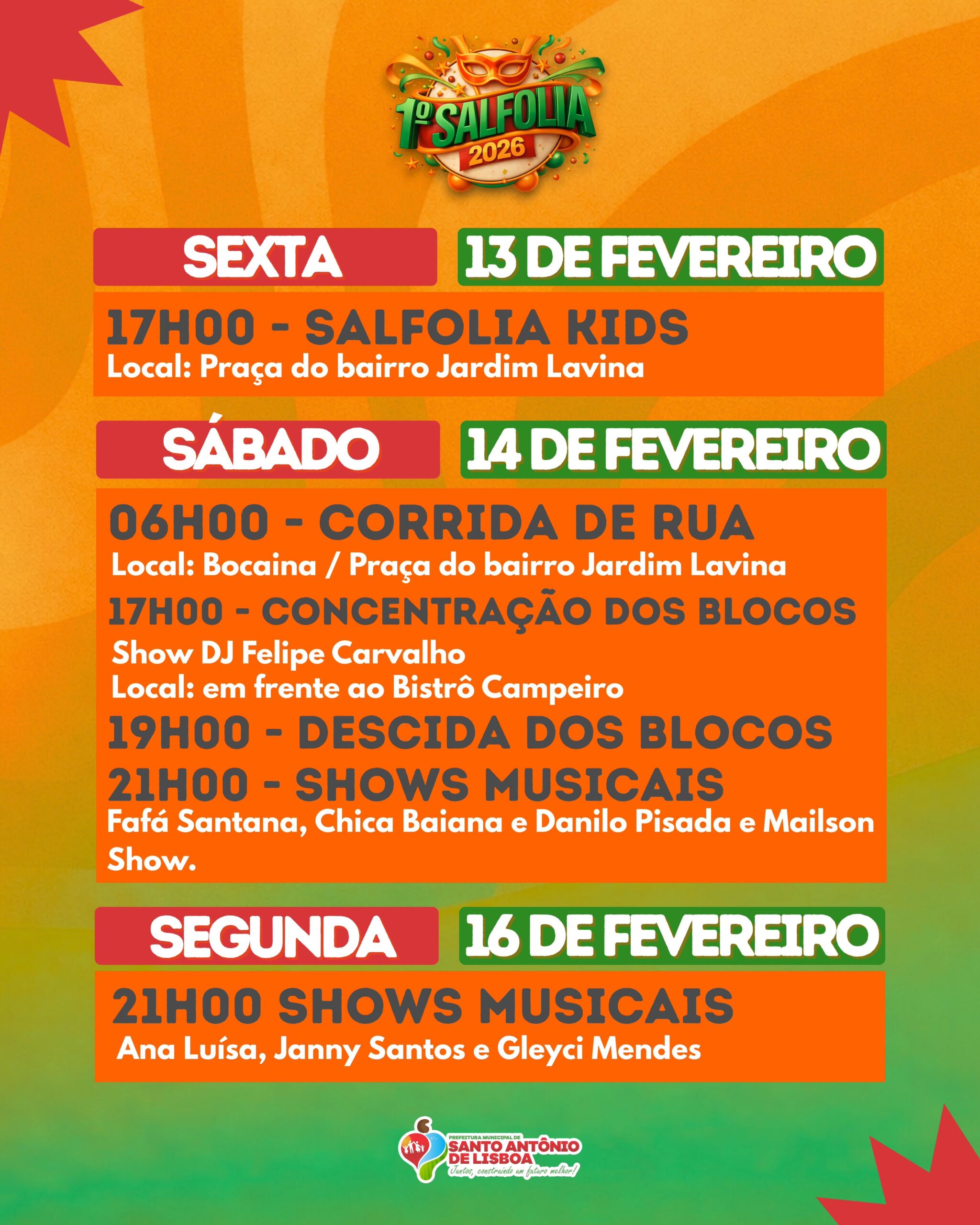 A Prefeitura Municipal de Santo Antônio de Lisboa divulgou a programação oficial do Salfolia 2026, prometendo três dias de muita alegria, esporte, música e tradição para toda a população. O evento reúne atrações para todas as idades e consolida o carnaval como uma das festas mais aguardadas do município.
